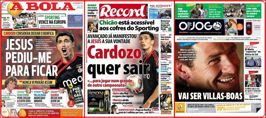 O que poderá não ser fácil face à relutância da SAD em deixar sair jogadores abaixo da cláusula de rescisão. A de Cardozo está fixada em 60 milhões de euros.